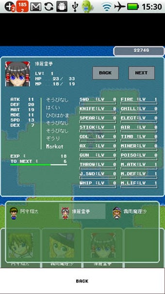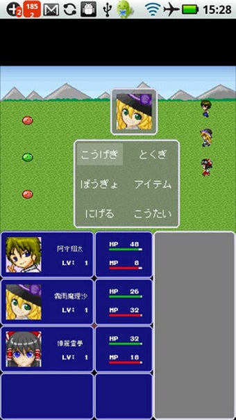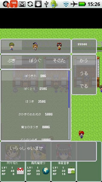 Dot Homeはホームアプリをゲームとして楽しむユニークなホームアプリです。起動するとまず最初の町にいる住人がホームアプリの使用の仕方を教えてくれます。基本的なホームアプリ機能を利用するにはまず道具屋に行って端末内にインストールされたアプリを道具屋から購入し、3人パーティの主人公たちに装備させなければなりません。装備するとメイン画面の主人公たちの顔写真の下にアプリが出てきますので、ダブルタップするとアプリを起動できるようになります。装備のほか「メニュー」から「アイテム」を選択してアプリを起動させることもできます。この機能以外はほとんどRPGです。武器・防具屋があり主人公たちの装備を買いそろえることもできますし、町の外に出ると敵が襲いかかってきます。これらを倒してお金を稼いだりしながら主人公たちを成長させられます。バージョンアップなどでダンジョンなども加わる予定のようです。